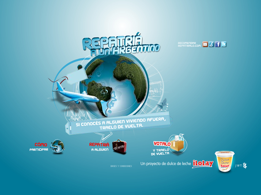 Quisieron reforzar el posicionamiento de ser un símbolo nacional y aprovechando el slogan “El Dulce Orgullo de ser Argentino” no encontraron mejor forma que tocar la sensibilidad directa del mismo Argentino, el traer a esa persona que tanto quieres de vuelta a su país. Como sabemos, por diferentes motivos los Argentinos son del perfil de personas que siguen un rumbo profesional en distintas partes del mundo. El traerlo a sus bases lo llamaron “Repatriá a un Argentino” claro, directo, de mecánica deducible, potente para atraer a los participantes. Sobretodo si en ese contexto te lo dice un “dulce de leche”.